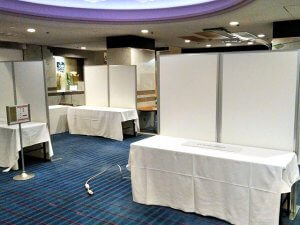 設営・撤去する時間が短く、簡単にポスター掲載できる掲示板や白板では、ホテルの景観や学会の雰囲気を損ねてしまう為、設営時間の短いパーテーション、Eパネルをご提案させていただきました。Eパネルは工具をほとんど使用せずに組み立てが可能で、一般的な他のパーテーションと比較して短時間で設営ができる事をご説明させていただきました。さらにEパネルは白色の為、展示台としてテーブルに白布を敷いた会場とよく合い、ホテル・学会の景観にも違和感なくご利用いただける点を評価いただき、ご採用いただきました。