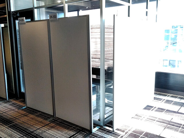 Eパネルは、お客様の『短時間で設営して欲しい』といったご要望にお答えする為に、当社が独自に開発したパーテーションです。従来のパーテーションと比べて軽量で持ち運びしやすく、設営時間も大幅に短縮されていますので、設営時間の短い条件でも安心してお任せください。