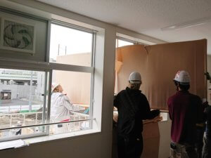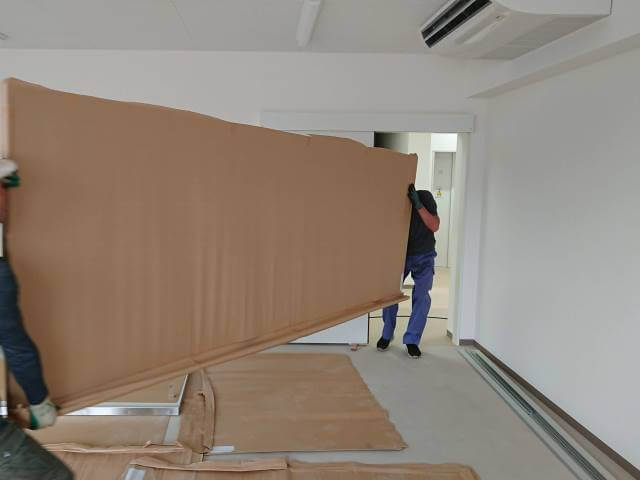 また、搬入時は工事期間中ということもあり、周囲の安全確認を徹底しながら、校舎内の床や壁、搬入する学校備品を傷つけないように養生を行って作業させていただきました。 -