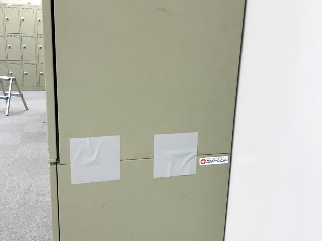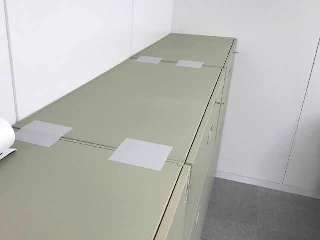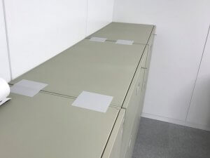 オフィスビルの床や壁を加工して傷つけることができないため、書庫などの備品同士に接着する事で耐震補強可能な地震対策グッズを使用するご提案をさせていただきました。