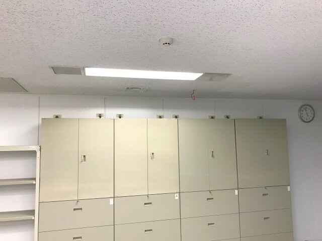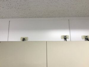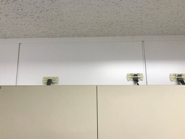 地震対策グッズの「リンクジョイント」で書庫と書庫の上下左右の境目に貼って補強しています。オフィス内には、一部既存の壁ではない部分がありましたので、壁と書庫とを「キャビネットホルダー」を使用して、さらに強固な補強をさせていただきました。大きな地震が、いつどこで発生するか予測することができません。特に長期間レンタルいただく場所では耐震補強対策をオススメさせていただいております。