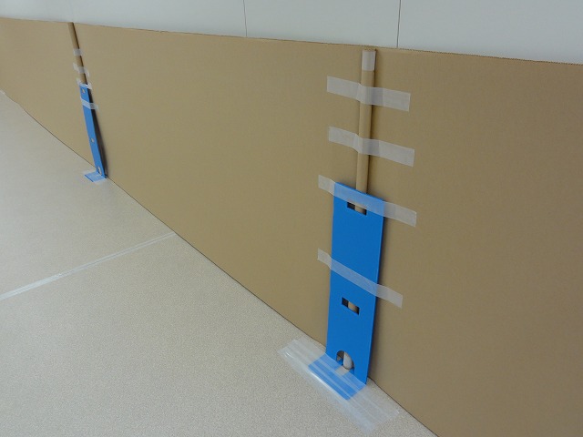 養生テープの使用が認められていないビルの為、テープの代わりとなるL字型の養生プレートを使用して壁面を保護いたしました。また、収納スペースがない状況で、オペレーターの手荷物を入れる為に折りたたみコンテナを活用していただきました。