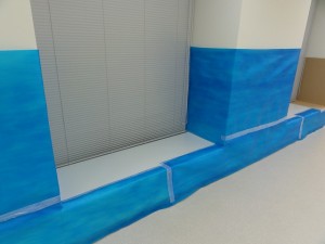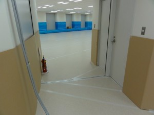 テナントビル内のフロアにコールセンターを設置される為、業務で使用する長机、椅子等をレンタルでご利用いただきました。お客様のご要望で、後で原状回復工事が発生しないよう、フロア、入り口、エレベーターの壁面を養生材で覆いました。