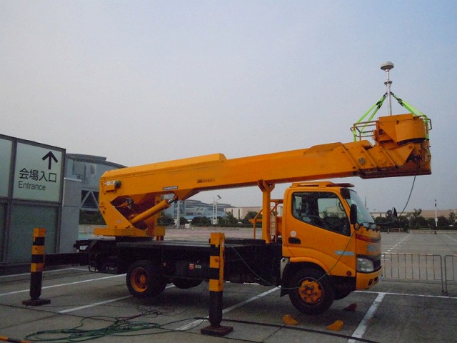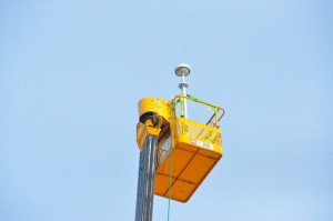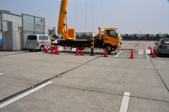 イベント会場への落雷を防ぐため、抑制型避雷針「避雷ドーム」を設置させていただきました。イベントは3日間のみの開催で、周囲に取り付け可能な建造物が無かった為、高所作業車のアームの先端に避雷ドームを取り付け、地上から約20メートルの高さになるように設置しました。
