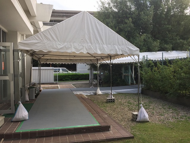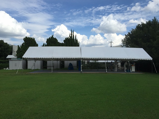 国民体育大会の弓道競技の選手控え場所として、競技会場の屋外にパイプテントを利用して仮設の控室を設置いたしました。