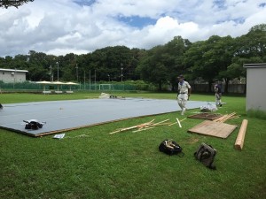 競技の特性上、履物の脱ぎ履きをしなくても済むように、控室と競技会場まで通路を作ってつなげ、雨対策として通路上にもテントを設置し連結部にすべて樋(とい)を設置いたしました。