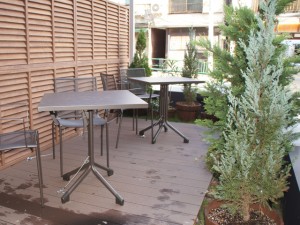 マンションギャラリーのウッドデッキには、オープンカフェをイメージしたテーブルや椅子と植栽を配置し、お客様に大変ご好評いただきました。