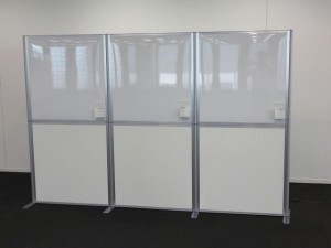 工期の遅れにより随時内装工事が始まるとのことで、オフィスと会議室のレイアウト変更や撤去のことを考慮して、組立て・撤去が簡単なEパネルをご提案させていただきました。