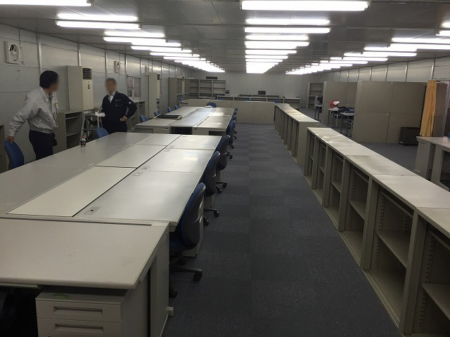 大型物流倉庫建設現場の事務所(約40m×9m 2F建てのプレハブ)へ平机・回転椅子・ワゴン・ユニバーサルテーブル・アングル棚・エアコン・OA機器等を納品いたしました。