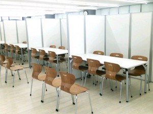既存の食堂テーブルと椅子はバックヤードを設置して格納し、説明会終了後は、食堂の原状復帰を行いました。