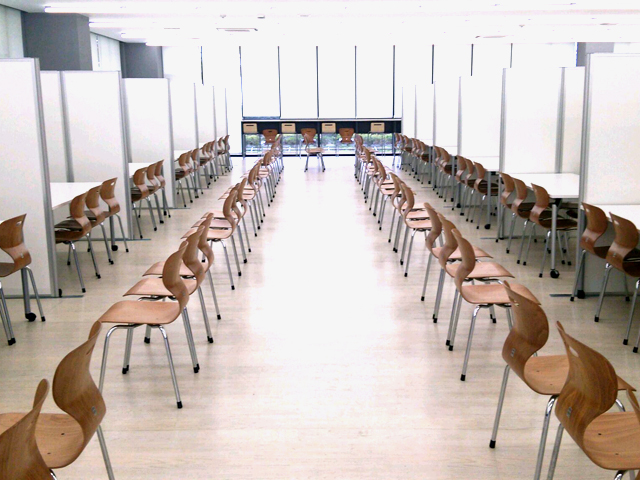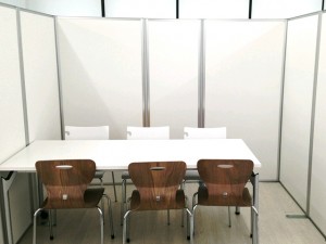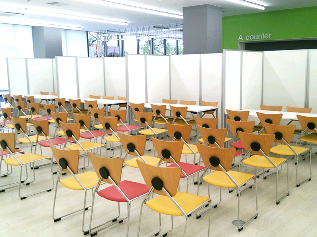 大学の食堂を利用した企業説明会にて、各企業のブースを設営いたしました。間仕切り用にEパネルを112枚レンタルいただき、合計25ブース分の区画を設け、椅子は1ブース辺り企業側3名、学生側6名が座れるように配置させていただきました。
