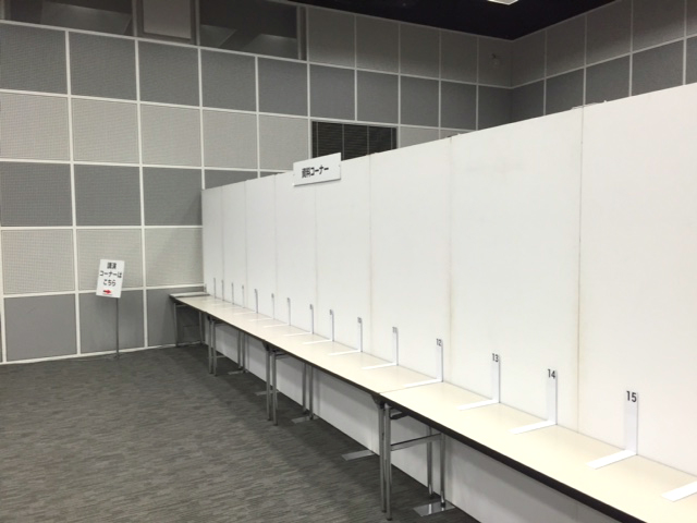 転職を希望されている方向けの合同企業説明会で、各企業ブース、講演コーナー、資料コーナーに、パーテーション、テーブルをレンタルいただきました。お客様のご要望で、各企業ブースは高さ2,100mmのパーテーションを十字、L字に組んで間仕切り、会場に備え付けの机や椅子などの備品も合わせて設置させていただきました。
