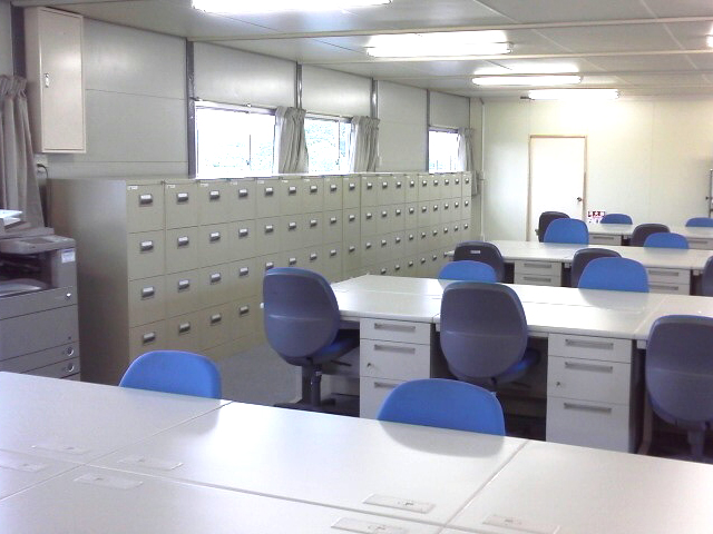 発電所内の2階建仮設ハウスに、オフィス机、椅子、テーブル、応接セット、ロッカー、アングル棚などの事務所備品をレンタルでご利用いただきました。