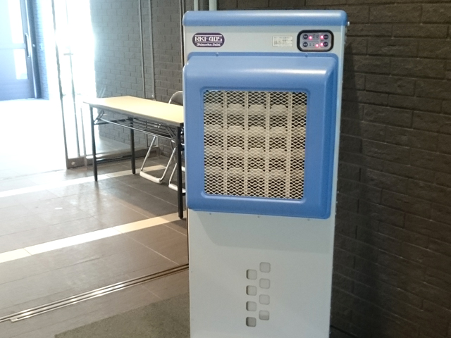 事前に打ち合わせを行い、エアコンなどで室内を冷やすことよりも、エントランスの扉を解放し、冷風機と工場扇を併用して風通しを良くする案をご提案させていただきご採用いただきました。