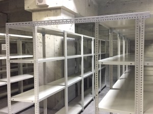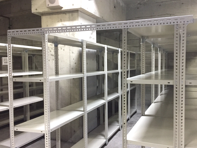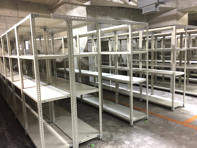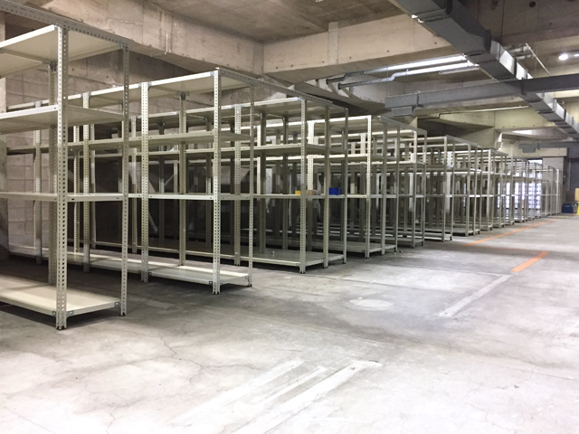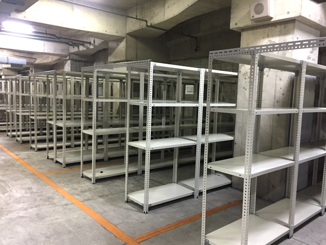 内装工事会社様の図面を保管している倉庫を移転されるため、約1ヶ月の間、図面を一時的に保管する倉庫を地下1F駐車場に設置する事になり、255台のアングル棚をレンタルでご利用いただきました。