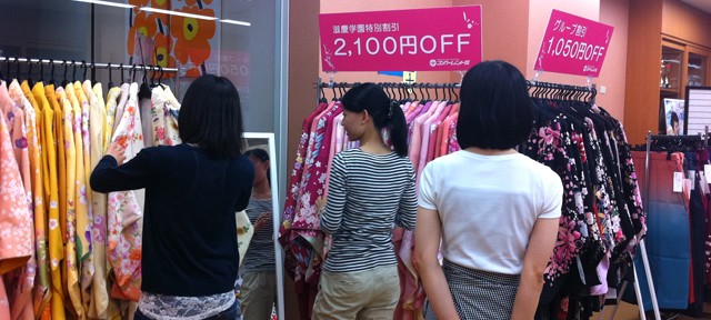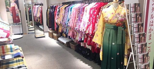 卒業式でお召しになる袴などの晴れ着をレンタルでご利用いただいた事例をご紹介いたします。店舗や特設会場に衣装を展示して、ご来場いただいたお客様に自由にご試着いただきながら衣装をお選びいただきました。式当日には衣装の着付けやヘアメイクもご利用いただいております。