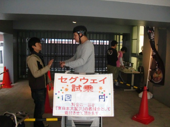 お客様にセグウェイ試乗という新しい体験をしていただくとともに、震災復興への手助けにも貢献できるということで、多くのお客様からご協力を頂戴いたしました。