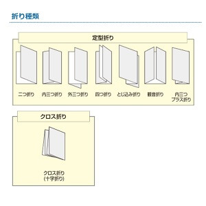 ■折り型:二つ折り、内三つ折り、外三つ折り、四つ折り、とじ込み折り、観音折り、内三つプラス折り、クロス折り